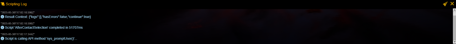 will open the scripting log at the bottom of the screen. This log will show the status of tasks within the scripting manager as well as when event hooks trigger a script to run.