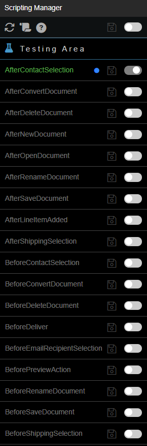 The Event Hooks list displays all of the events that can trigger a script. Each event can be toggled on or off and if changes are made you can commit those changes by clicking on the save icon. The save icon will display in red when there are uncommitted changes.