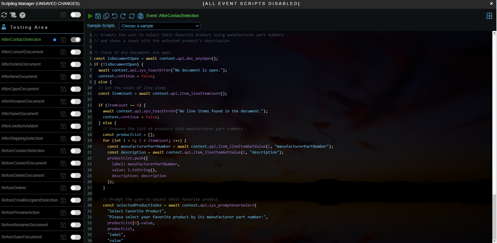 Clicking on Testing Area opens a window where you can choose sample scripts, write your own, and use the AI assistant. Simply select a sample or write your own script. When you are ready to test the script click on the play button. Once you are happy with the script you have built click on the save icon to save the script. You also have the ability to copy the script, undo and redo changes, reload the event script from the server, and access the AI Assistant, which can write scripts based on your prompts.