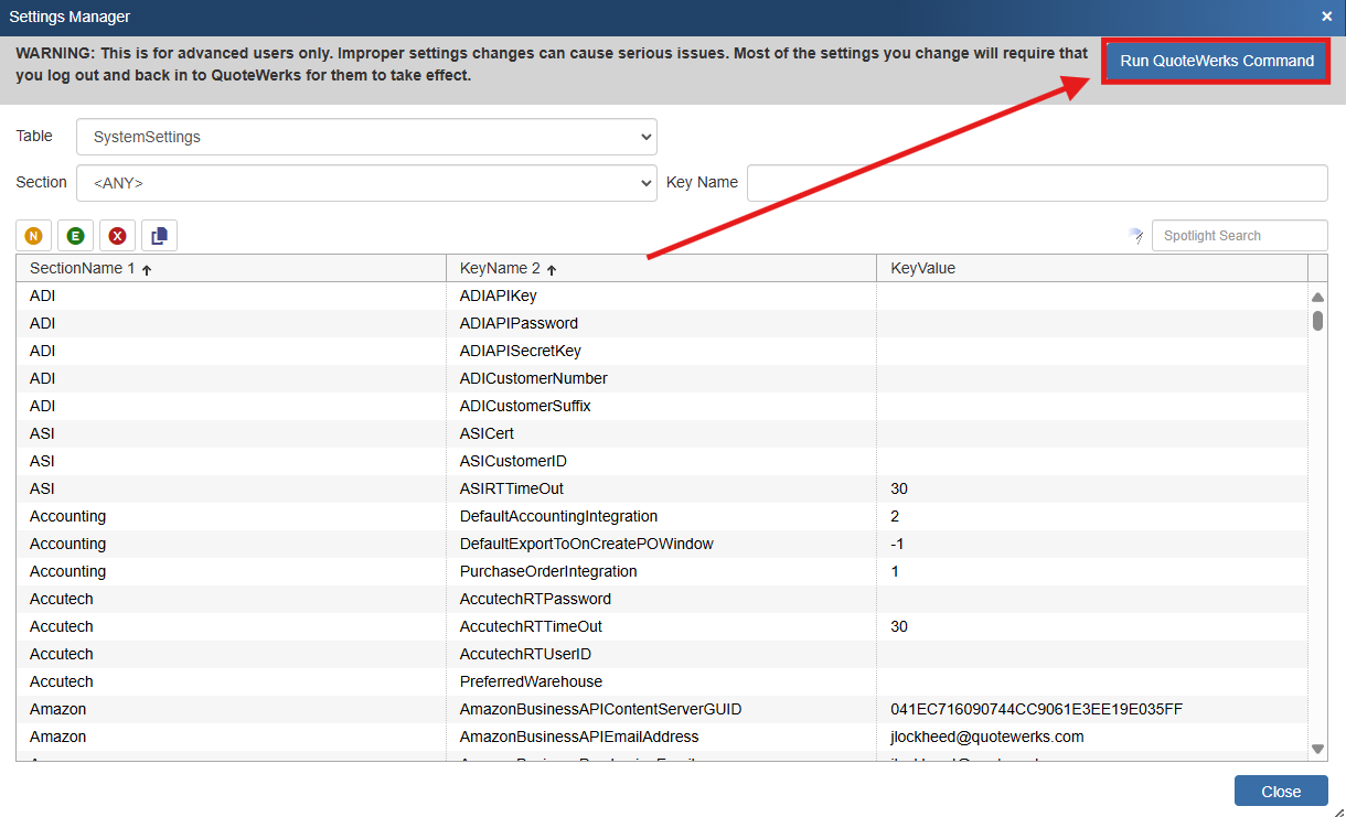 Important:   Warning! This information is for advanced users only.  Improper settings changes can cause serious issues.  Only make changes if familiar with these settings and what needs to be changed.  Additionally, most settings modified in this window will require a restart of QuoteWerks to take effect.  Please contact tech support before proceeding with any changes.