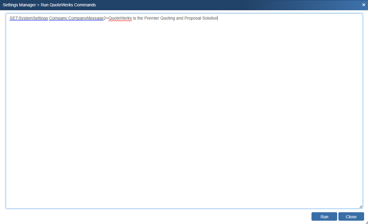 2.Type in the command you wish to run.  Use SET, GET, or DELETE followed by a colon, then the table name, the section name, and the key you wish to adjust. For our example, to change the CompanyMessage2 field, the command should look like this: SET:SystemSettings:Company:CompanyMessage2=QuoteWerks is the Premier Quoting and Proposal Solution