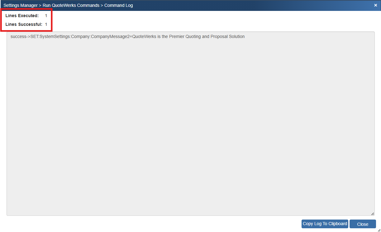 Also, since multiple commands can be run at the same time, administrators can grab multiple settings and apply them to other users in an automated fashion. QuoteWerks Sales Partners can use these commands to apply standardized customizations to any installation.