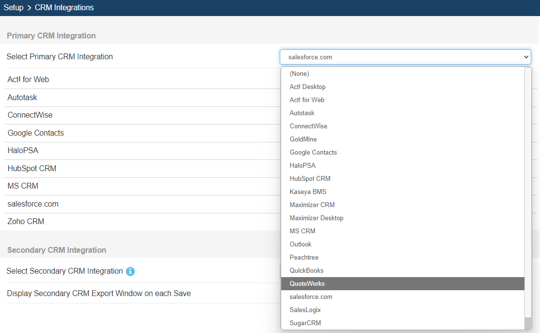 Select the Contacts -> Setup Contact Manager menu to choose your contact manager. Select the QuoteWerks option and click OK: