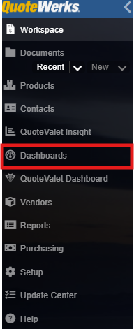 The QuoteWerks Dashboard is accessible by clicking on Dashboards from the left navigation panel.