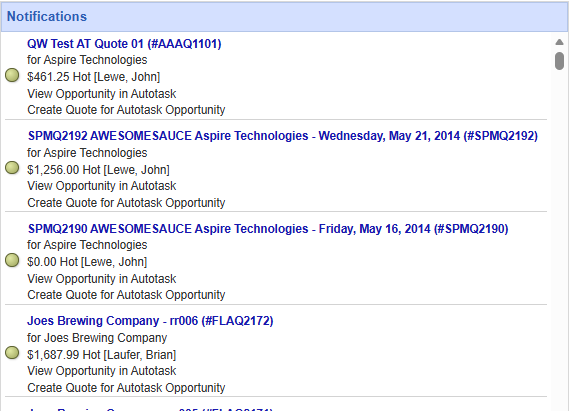 The Notifications panel on the QuoteWerks Dashboard displays opportunities in Autotask with statuses you set under QuoteWerks' Autotask Settings tab. If you don’t have statuses set up in Autotask, you’ll need to add them to your Autotask status list for Opportunities for the Notifications feature to work.