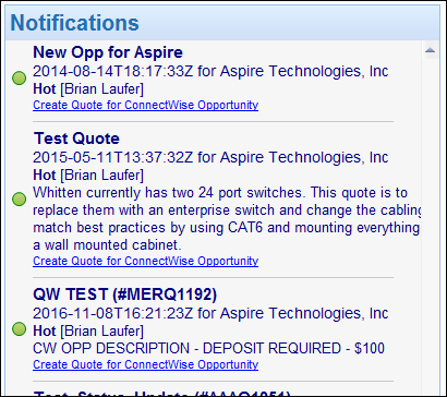 The Notifications panel on the QuoteWerks Dashboard displays opportunities in ConnectWise with statuses you set under QuoteWerks' ConnectWise Settings tab. If you don’t have these statuses set up in ConnectWise, you’ll need to add them to your ConnectWise status list for Opportunities for the Notifications feature to work. See Notifications (ConnectWise) for more information.