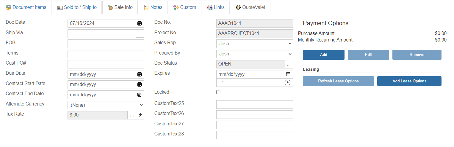 The Sale Info tab stores additional information important to the overall quote. Here, you can specify a document status, shipping terms, payment terms, customer PO number, invoice date due, tax rate, alternate currency, sales rep, prepared-by user, and more.