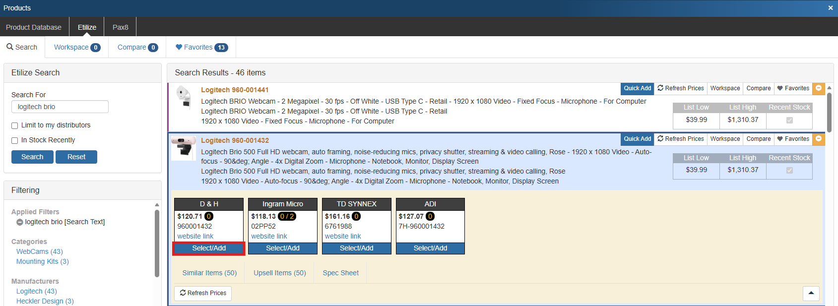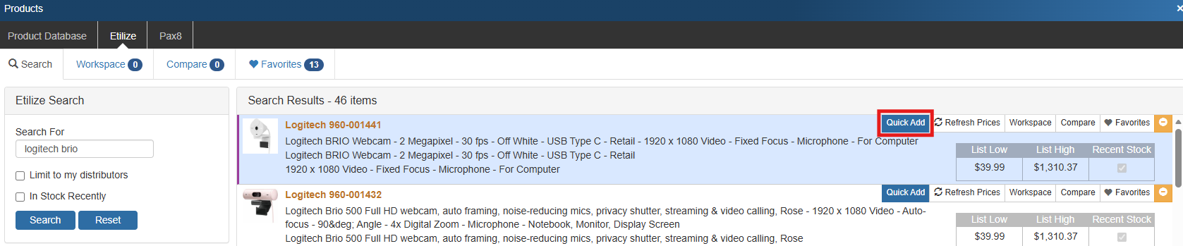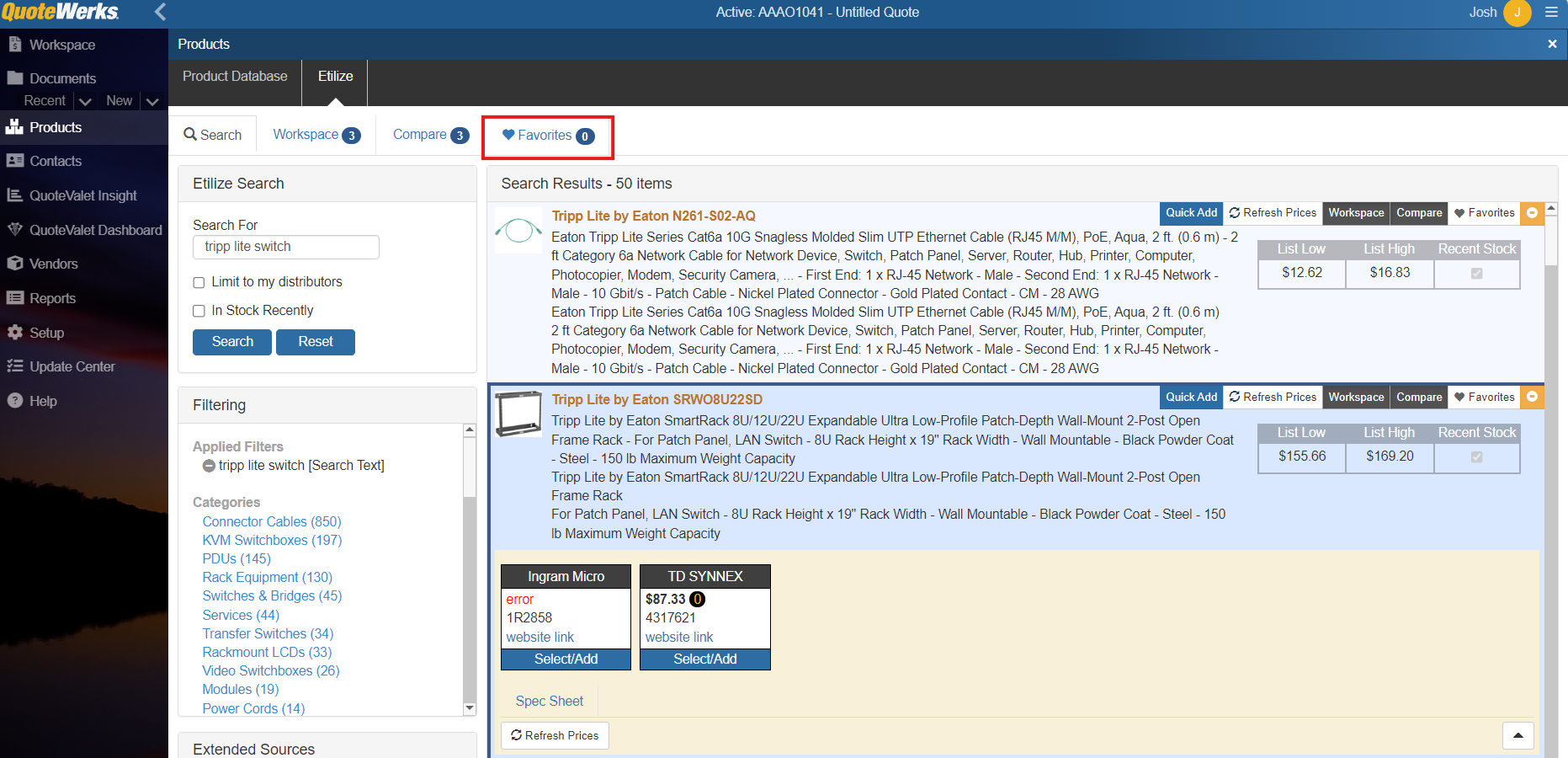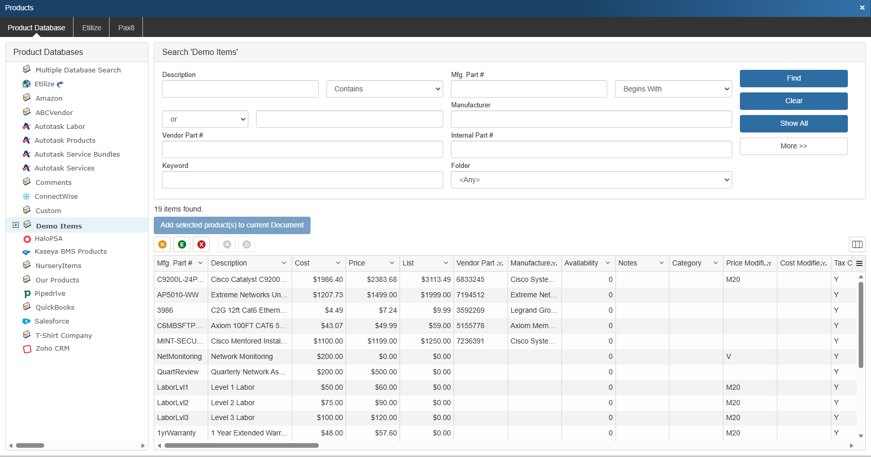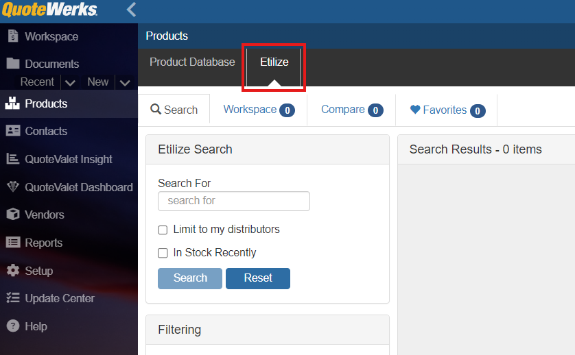 The Products menu will display a list of all the available product sources.  Any item databases that have been setup in QuoteWerks will be displayed in the products databases window and available for use.  Users are able to search by manufacturer, vendor part number, description, manufacturer part number, and/or keyword.  Users can access this by clicking on Products from the left navigation panel or by clicking on Products-> Lookup.