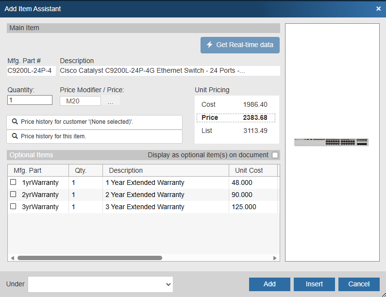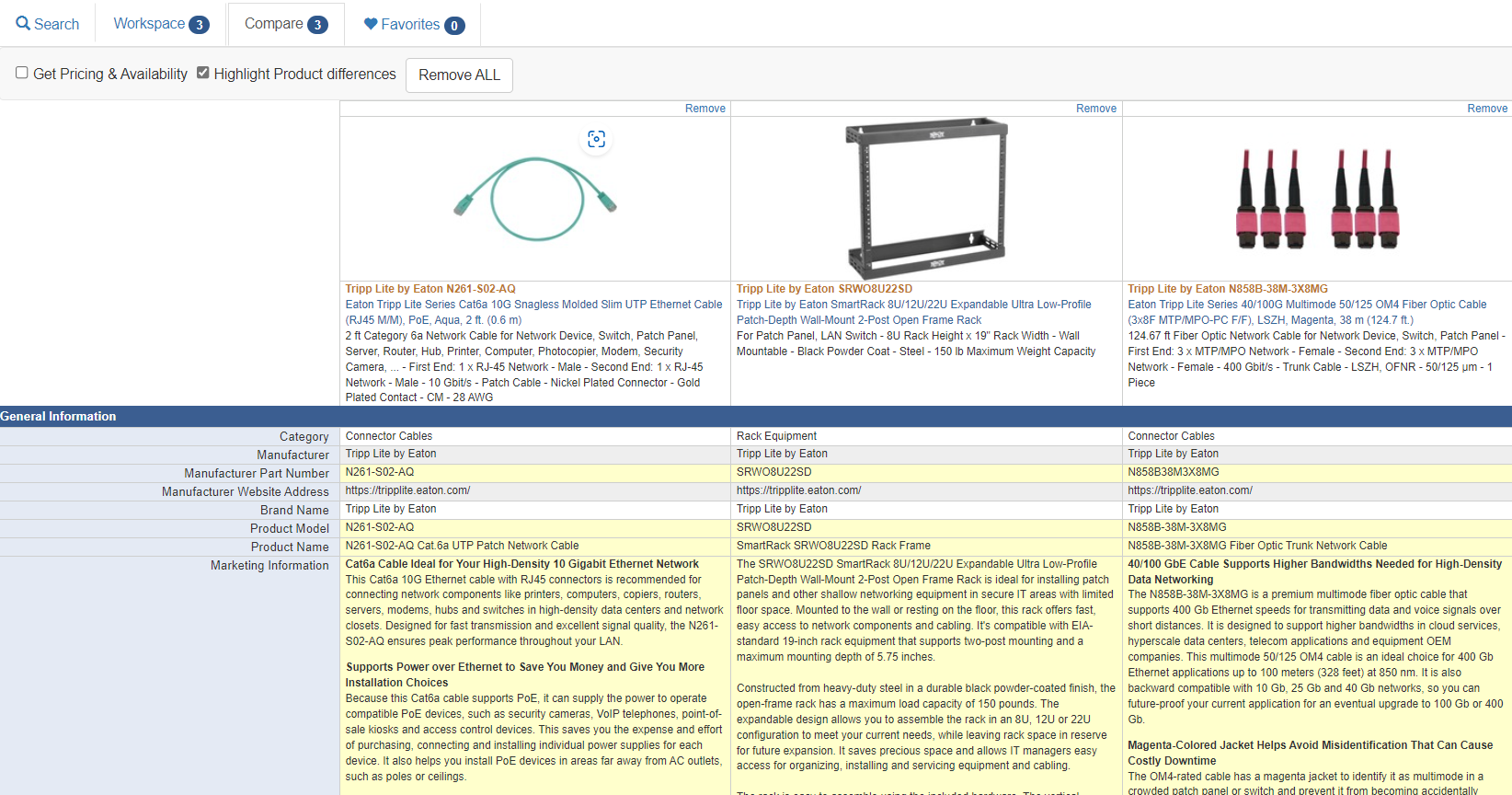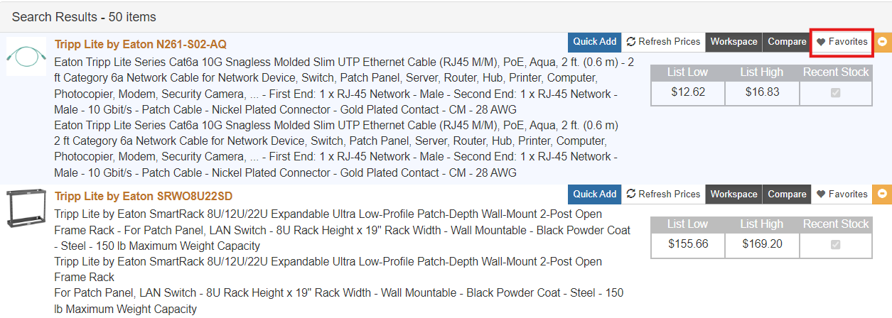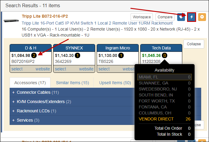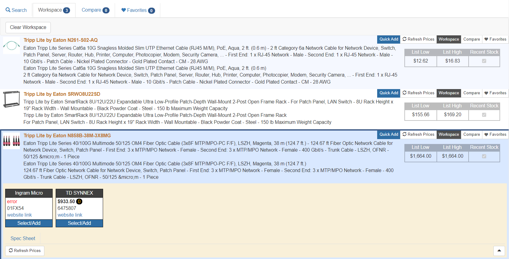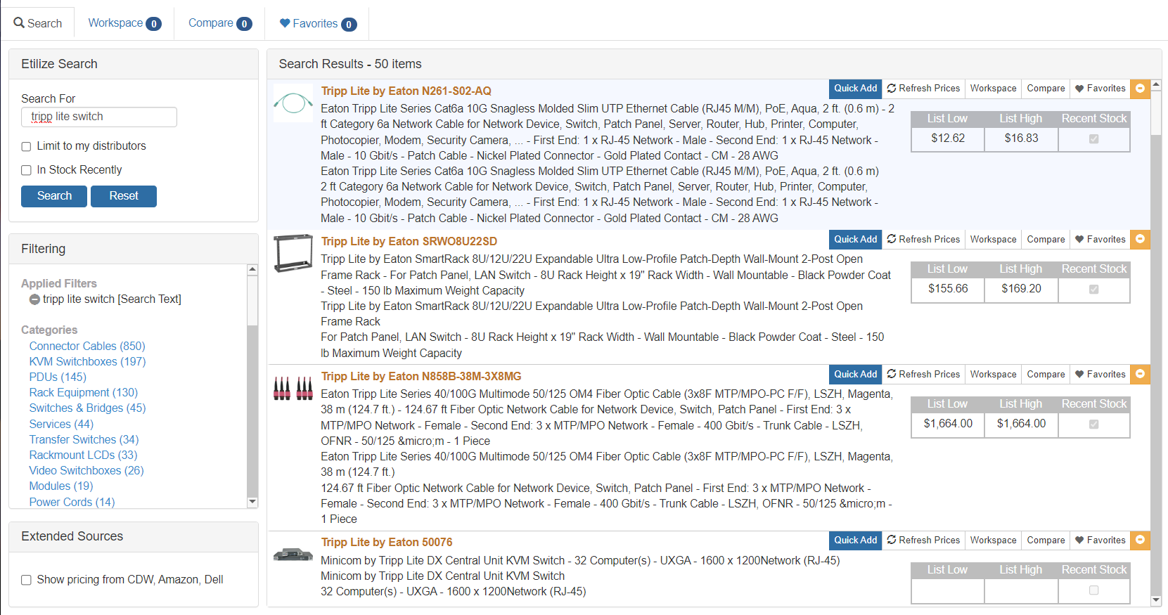 The Products menu will display a list of all the available product sources.  Any item databases that have been setup in QuoteWerks will be displayed in the products databases window and available for use.  Users are able to search by manufacturer, vendor part number, description, manufacturer part number, and/or keyword.  Users can access this by clicking on Products from the left navigation panel or by clicking on Products-> Lookup.