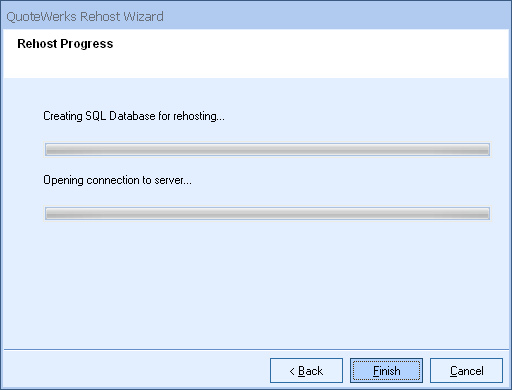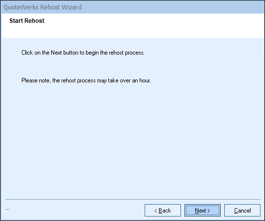 Important: Once you start the Rehost process, you will need to wait until it completes before using QuoteWerks. Most companies will be able to rehost in just a few minutes, but if you have a large database, this process can take up to multiple hours. Be sure you have allotted enough time for it to complete. |