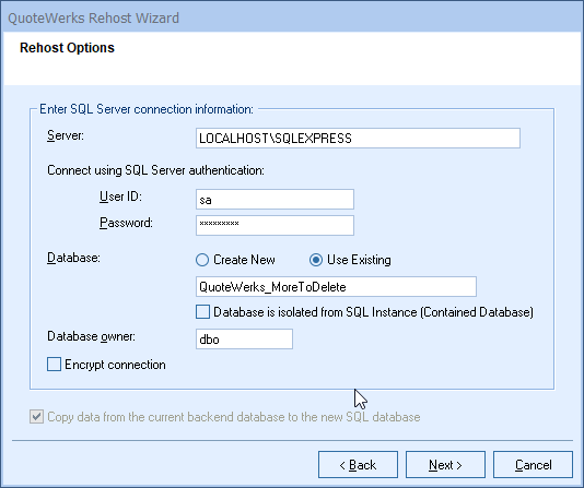 Important: The Utilities -> Rehost Backend menu may not be enabled. To enable it, you must meet the following three conditions: 1.QuoteWerks can be using an Access or SQL backend. 2.A Corporate Edition License Key must be entered in this installation. 3.The user who’s logged in to QuoteWerks must have QuoteWerks Master Rights. |