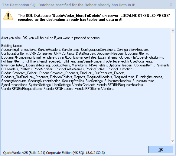 If rehosting to an existing data base you will receive a warning indicating that the destination already has tables in it and it will display a list of those tables.