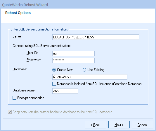 Step 2: On this window, specify the SQL Server name, User ID, Password, Database owner, and New Database name you want to create to host the QuoteWerks data (we recommend “QuoteWerks”). If you are rehosting to an existing SQL database, you do not have to supply a SQL server User ID and can specify the existing database that you would like to rehost to instead.