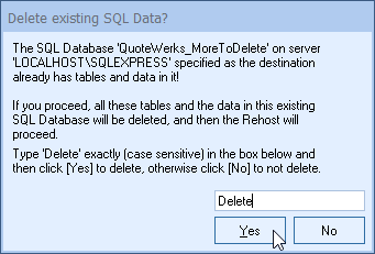 In order to continue with the rehost process you will need to approve the deletion of existing tables by typing Delete and pressing the Yes button.