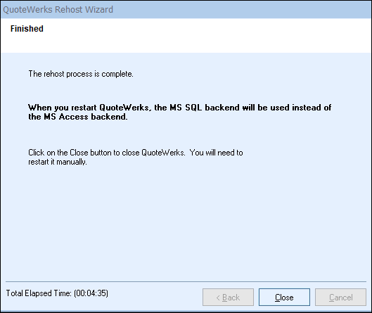 Step 5: On the final window a message will display letting you know the process has completed and that you will need to close QuoteWerks and restart for the changes to take effect. Click on the [Close] button to finish the rehost wizard.