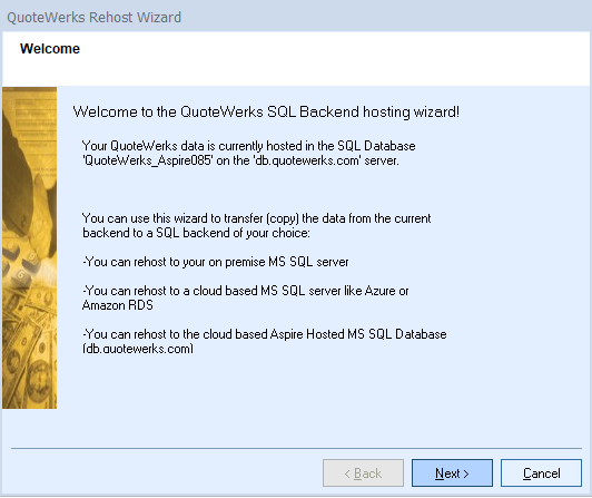 Before you can re-host to SQL, you must install SQL Server so QuoteWerks can re-host to it OR have signed up to host SQL with QuoteWerks.