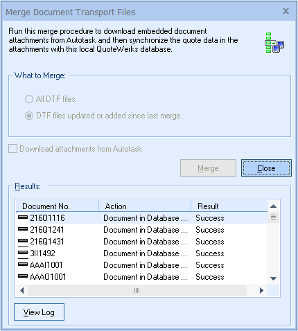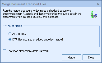 For appropriate CRM users, you can check the “Download attachments from (CRM/PSA)” option and then click on the [Merge] button to first download all the dtf files from your contact manager to this installation of QuoteWerks.