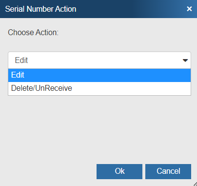 If you have marked an item as received and either entered in the wrong serial number or need to remove it completely, hold [SHIFT] on your keyboard and then click on the serial number you wish to edit.  This will let you choose from a drop-down of editing the existing serial number or deleting the serial number.  If you delete the serial number, the item will be marked as not received. This is a manual override process and will not undo the overall ReceivedOn, LineStatus, or CRM integration actions.