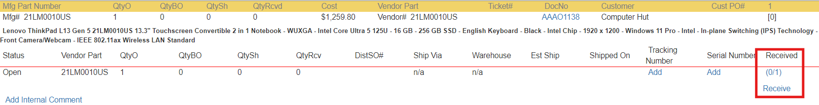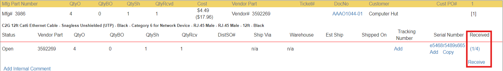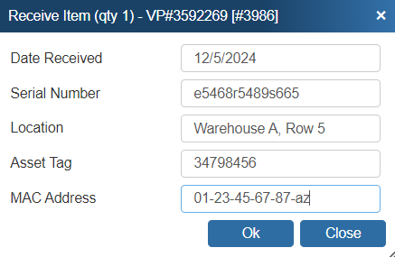 Select the appropriate serial number from the drop-down box and click OK to bring up the Receive Item window: