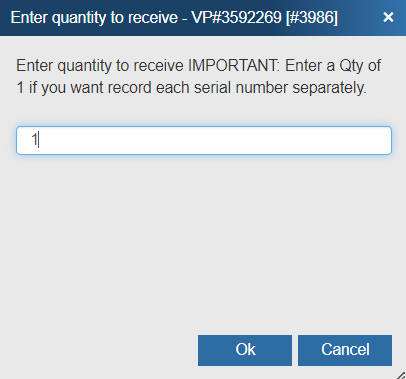Enter the quantity you wish to receive at that time, keeping in mind the message on the window: That each item must be receive separately if you want to assign them to separate serial numbers, if you have those listed.
