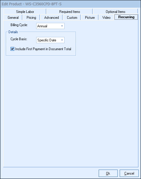 Here you can set whether this product recurs Weekly, Monthly, Quarterly or Annual.