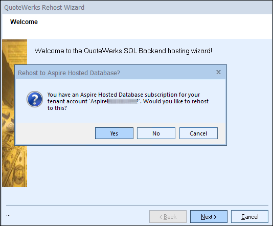 Step 2: On this window you will be prompted to use the QuoteWerks Database Hosting, click "Yes".