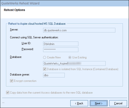 Step 3: On this window, your QuoteWerks Database Hosting credentials will automatically populate. You should not have to change any settings or fill anything in on this window. Simply click on the [Next] button. If those fields are still blank, your Database Hosting subscription is not active and you will need to contact the QuoteWerks Sales team.