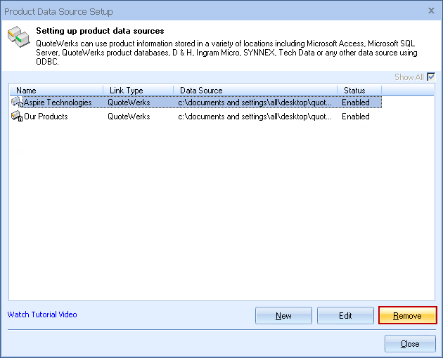 Select the database that you wish to unlink and click on the [Remove] button. Unlinking a database just removes it from your list of choices when searching for products. It does not delete the database file. In a network environment removing a link will remove that link for all the users sharing the network installation.