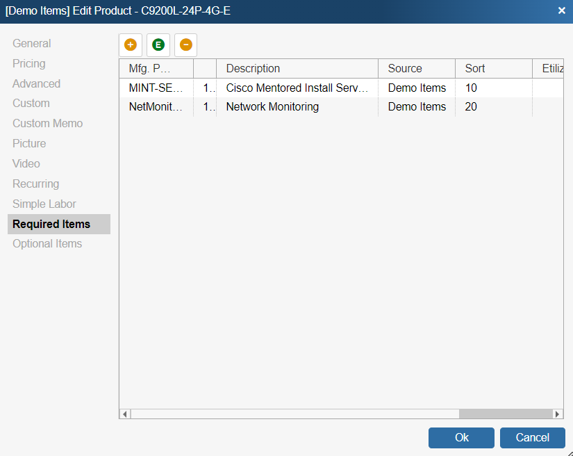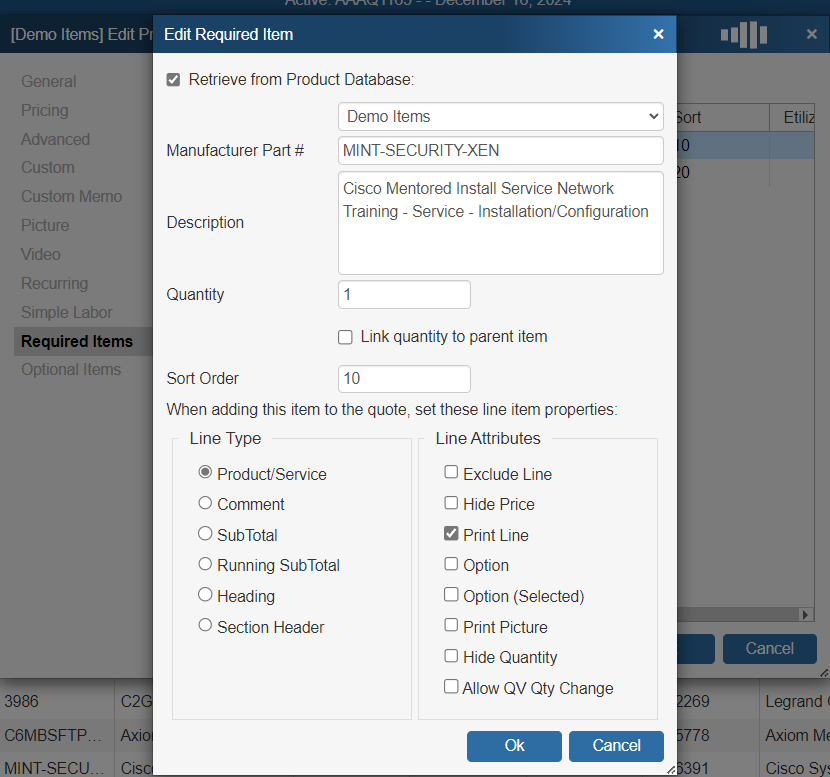 The Required Items tab enables users to assign single or multiple items to the "master" item. This will allow users to select the master item and any items listed on the Required Items Tab will automatically be added to the quote when the item is selected.