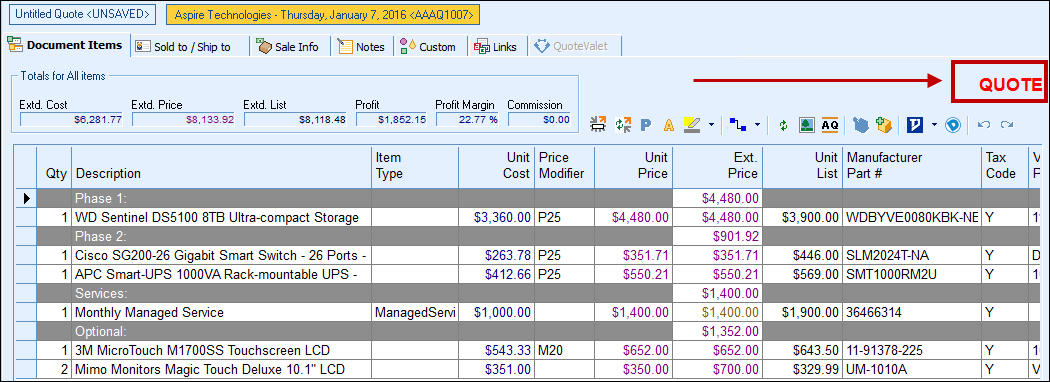 The Doc Status field is different from the document type, which identifies the document as a(n) QUOTE, ORDER, or INVOICE. The document type will appear in the upper-right-hand corner of the Document Items tab in the Quote Workbook. You can set the default status of new documents on the Installation tab under the Tools -> Options menu.