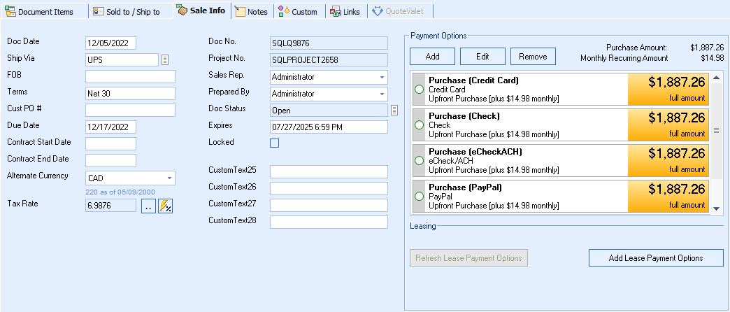 The Sale Info tab stores additional information important to the overall quote. Here, you can specify a document status, shipping terms, payment terms, customer PO number, invoice date due, tax rate, alternate currency, sales rep, prepared-by user, and more.