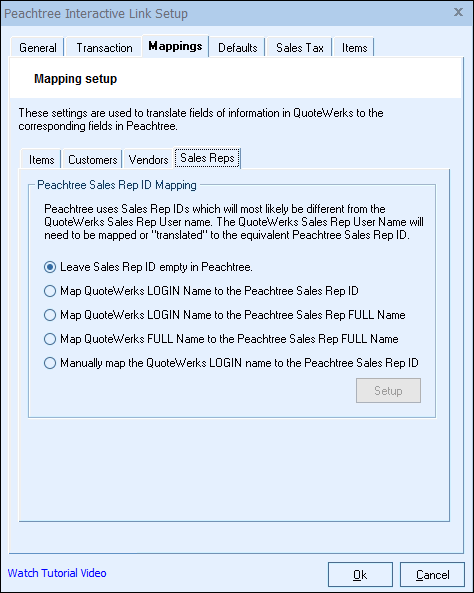 If you do not use Sales Rep IDs on your Sage 50 (Peachtree) Invoices/SalesOrders, you can choose this option to not pass a Sales Rep ID to Sage 50 (Peachtree) therefore eliminating the need to map the QuoteWerks and Sage 50 (Peachtree) Sales Reps.