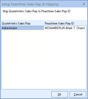 Sage 50 (Peachtree) uses Sales Rep IDs on Sage 50 (Peachtree) Invoices/Sales Orders rather than a Sales Reps full name. The QuoteWerks Sales Rep User Name needs to be mapped to the Sage 50 (Peachtree) Sales Rep ID equivalent.