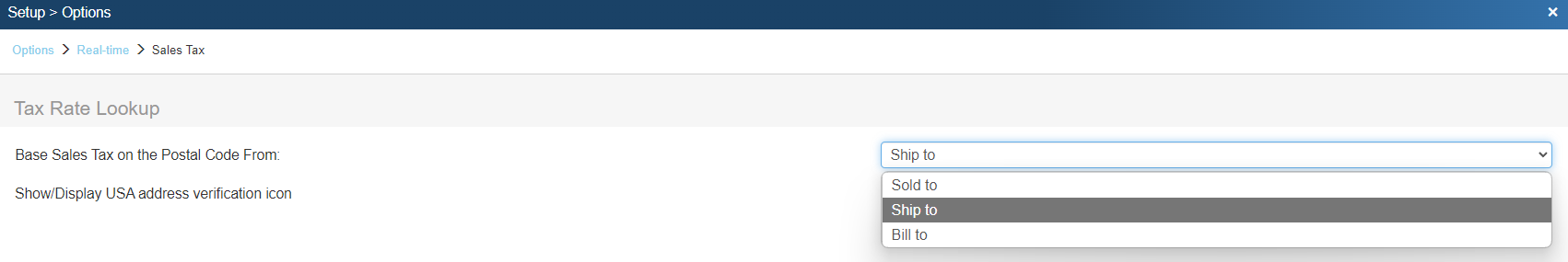 On the Sales Tax tab of the Real-time Setup window there is the option "Base Sales Tax on the Address From" to choose which address controls the sales tax rate. The standard is for the Ship To address to determine the tax rate locality.