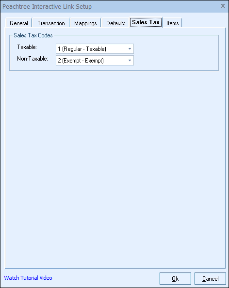 In the USA items are either Taxable or Non-Taxable. Because Sage 50 (Peachtree) uses numerical tax codes, you will need to tell QuoteWerks which Sage 50 (Peachtree) numerical tax code to use for a Taxable item and which to use for a Non-Taxable item.