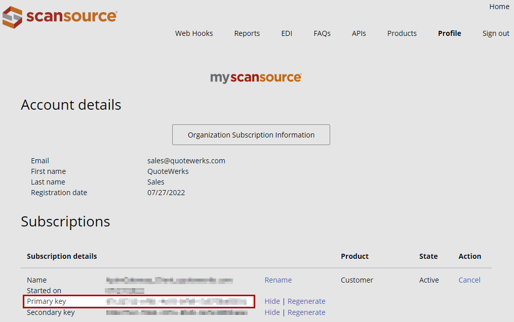 5. On the Organization Subscription Information page, retrieve the Primary Key and enter this into the API Key field: