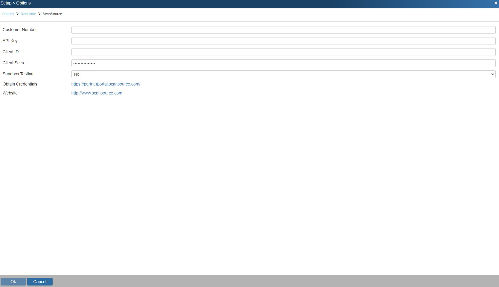 2. Input your Customer Number, API Key, Client ID, Client Secret, select whether or not you would like Sandbox Testing and click [OK]. How to get this information is outlined in the "Obtaining your ScanSource Credentials" section below.