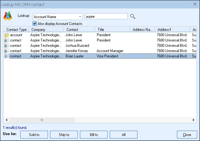Once you have found the account or contact you are looking for, select the contact and click on the [Sold To] button to use this contact for the Sold to information. You can also select a contact and click on the [Ship To] button to use this contact for the Ship to information or you can click on the [Bill To] button to use this contact for the Bill to information. When you are finished selecting contacts, click on the [Close] button. You will be returned to the Sold to/ Ship to tab and the selected contacts will be pre-filled in the Sold to/Ship to/Bill to fields.