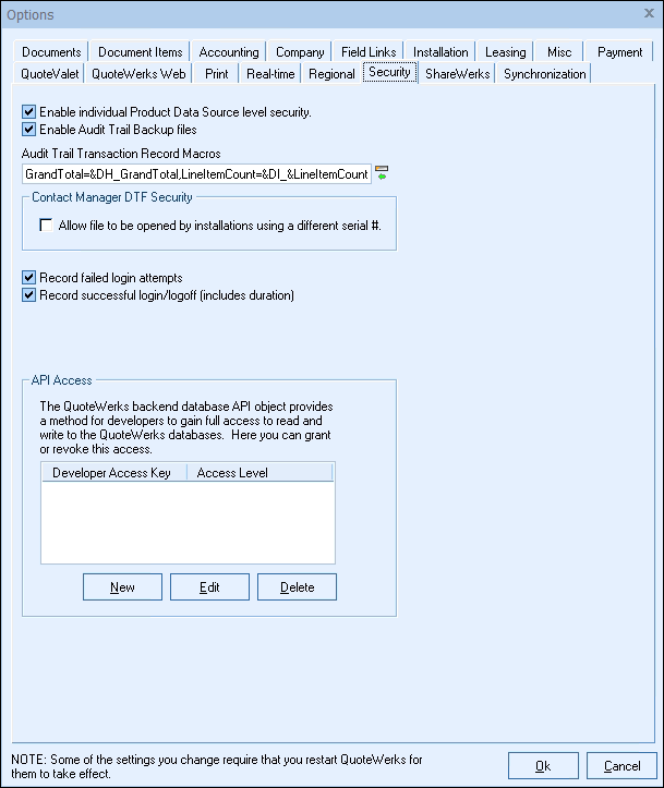 The QuoteWerks backend API object provides a method for developers to gain full access to read and write to the QuoteWerks databases. Here, you can grant or revoke this developer access.