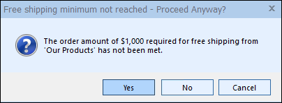 If you have specified a vendor minimum amount required for free shipping on the Vendor Maintenance menu in QuoteWerks, a window will will ask if you'd like to proceed anyway or add more items to the PO before creating it.