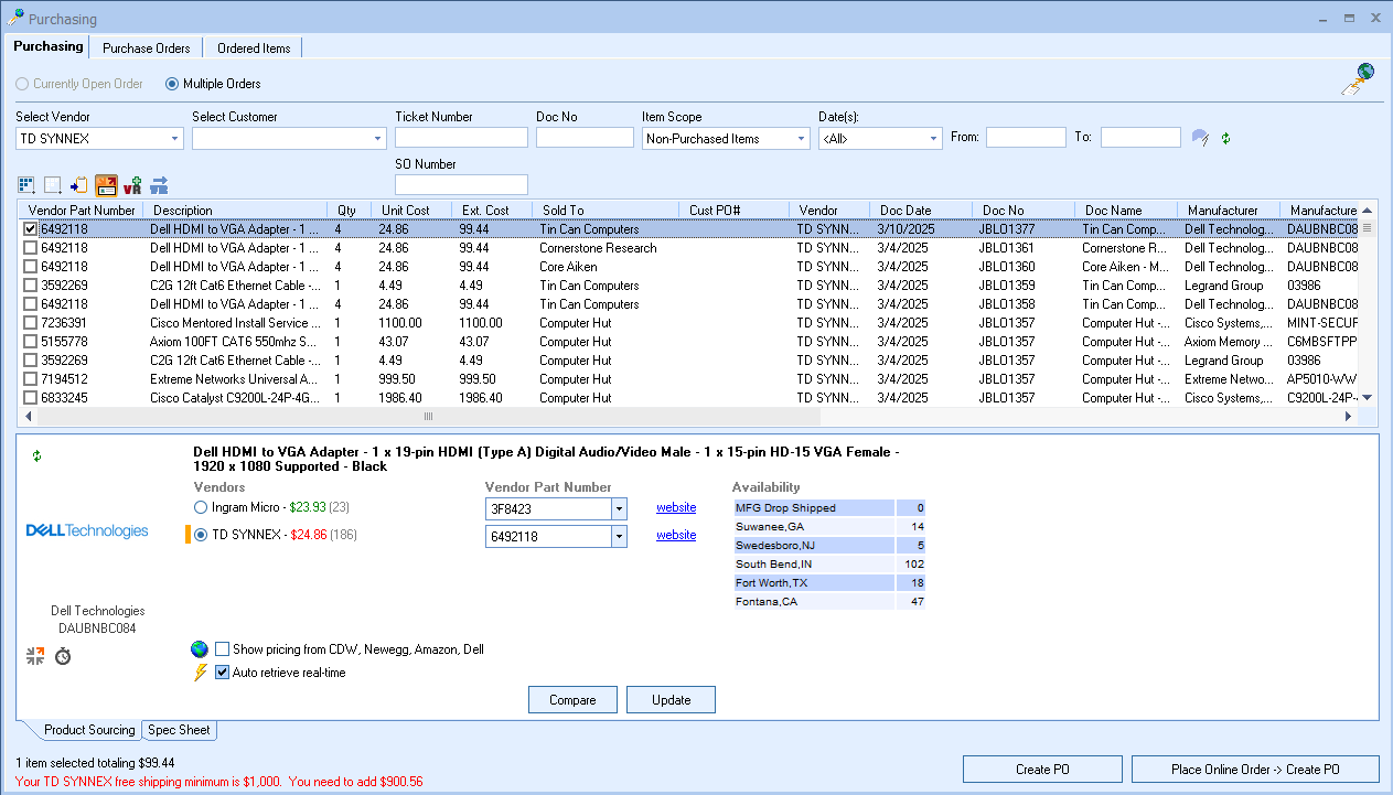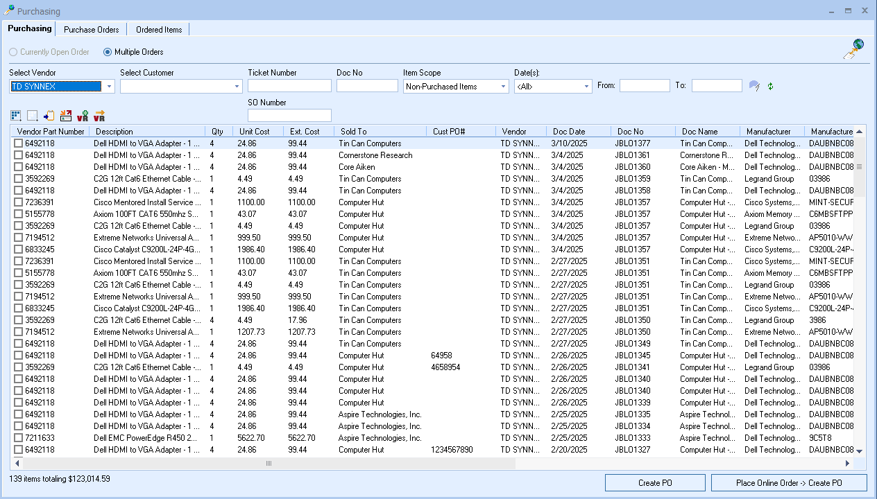 Note:When you choose to display TD SYNNEX items ready for ordering, only items that have a vendor of exactly “TD SYNNEX” will be displayed.  You can choose up to 50 line items for a single order.