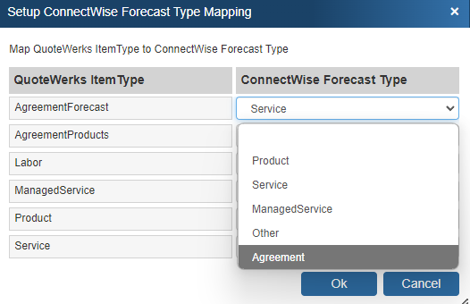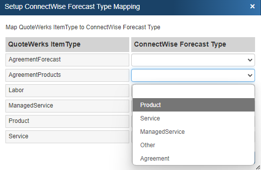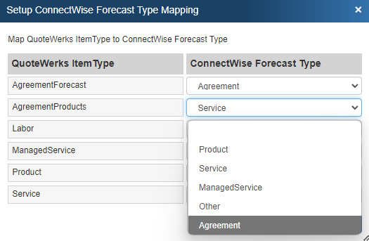 For sending over the Agreement as an Estimate, map an appropriate item type you defined in QuoteWerks (in this example, we defined AgreementForecast) to the ConnectWise Forecast type of Agreement: