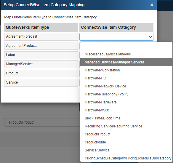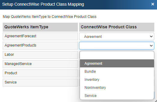 For sending over the Agreement as a Product, use an appropriate item type you defined in QuoteWerks (in this example, we defined AgreementProducts) to the ConnectWise Forecast type of Product: