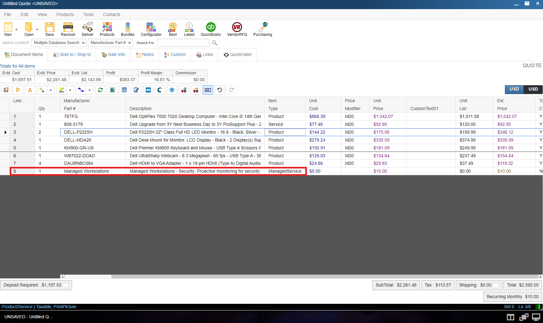 For this example, we manually add an Agreement Product to a quote with some other items: