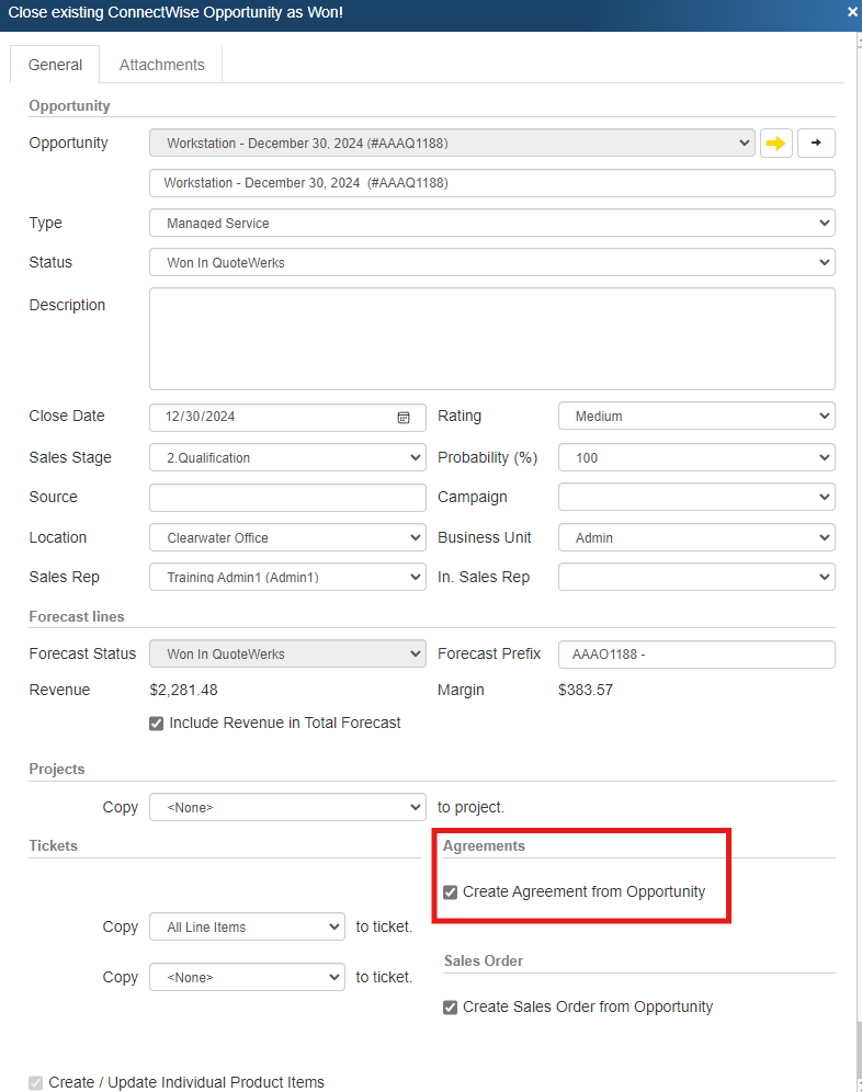 If the customer accepts your quote and you win the ConnectWise Opportunity, you'll see the option to create the Agreement from the Opportunity: