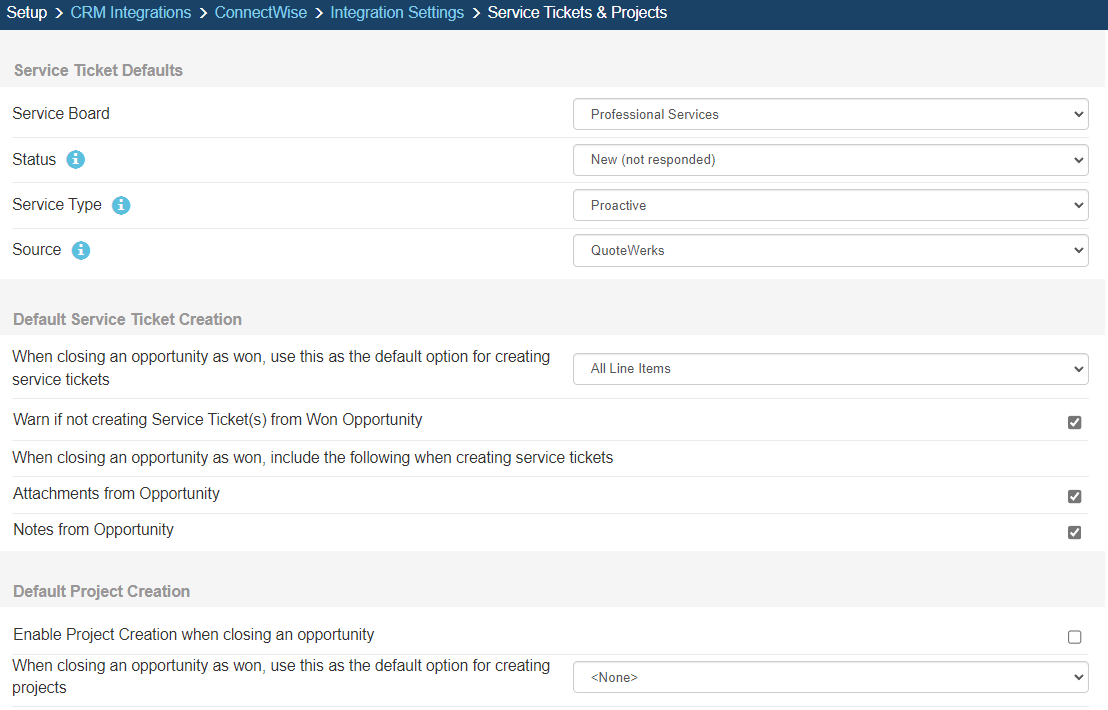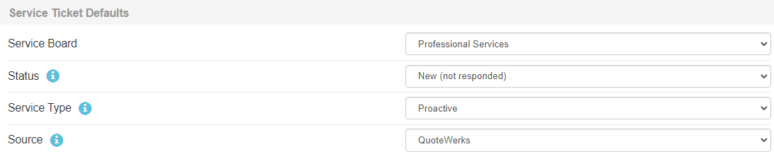 Under this section, you can set the default Service Board, Status, Service Type, and Source to be used when creating new ConnectWise Service Tickets from QuoteWerks.
