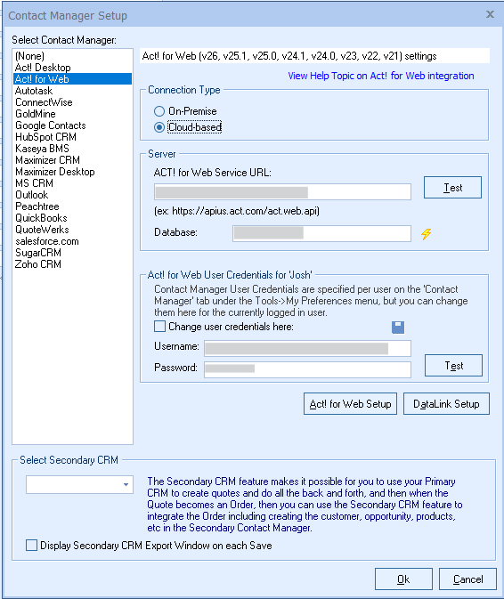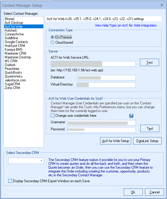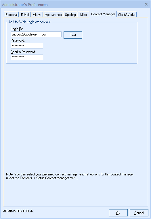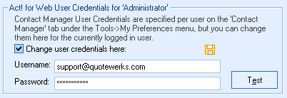 QuoteWerks also needs your Act! Username and Password to log into and integrate with Act!. Enter these credentials, click the Test button to verify them, then click the