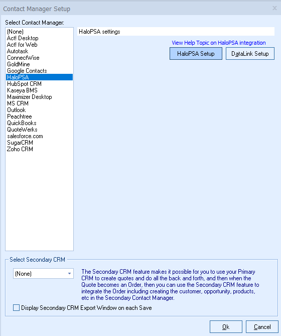 Select the Contacts -> Setup Contact Manager menu and select the HaloPSA option: