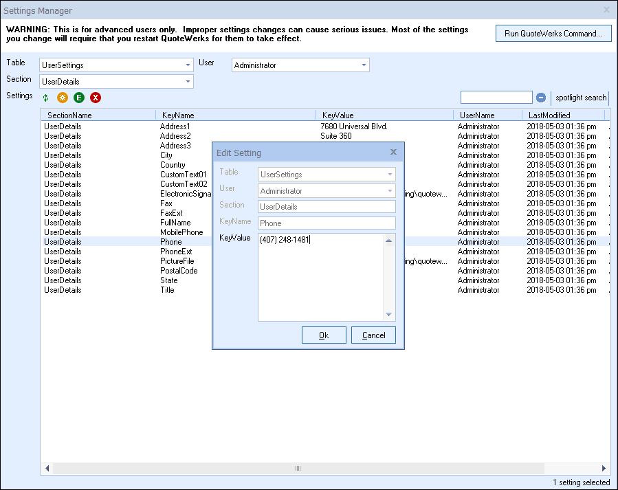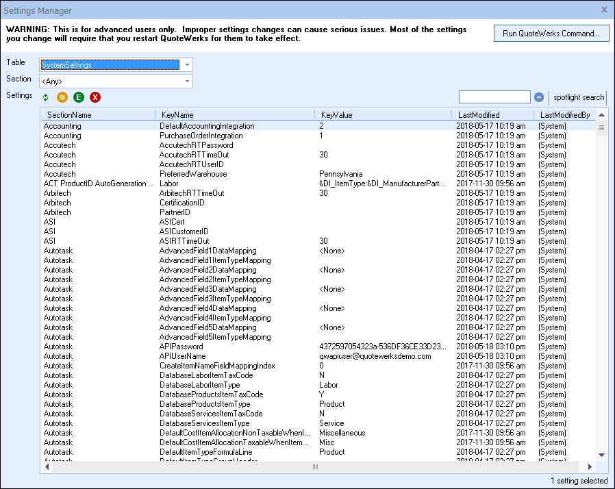 Important: Warning! This information is for advanced users only. Improper settings changes can cause serious issues. Only make changes if familiar with these settings and what needs to be changed. Additionally, most settings modified in this window will require a restart of QuoteWerks to take effect. The Settings Manager is available by clicking on Help-> About-> Setting Manager. |
