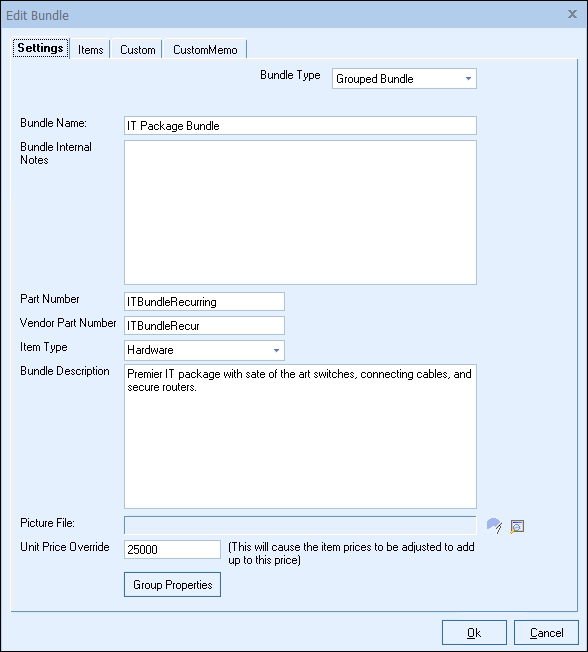 The Unit Price Override allows users to specify a specific amount for the Grouped Bundle. Typically, QuoteWerks takes the total of the line items in the Bundle and calculates that as the Bundle Header total. However, in some instances you may want to round the total number. Here you can specify the exact number you wish to charge for this Grouped Bundle by typing in the amount.